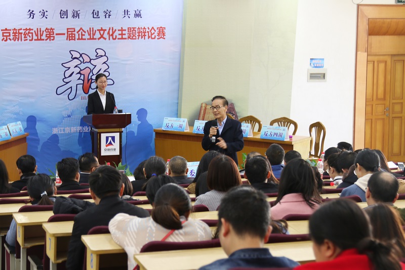 11月24日,京新藥業第一屆企業文化主題辯論賽正式拉開帷幕,辯論賽由各分子公司和職能部門共10支隊伍參賽。新昌中學原語文教師、教研組長、資深語文教育專家潘國仁老師、新昌中學原語文老師、資深語文語言專家俞雅麗老師、公司副總經理周林、中藥事業部總經理胡萬、藥品銷售管理中心總監雷新權、采購部總監劉勝、公司黨委副書記孔慶豐、商學院副院長戴軍、人力資源部經理陳芳等公司領導到場觀看并擔任比賽評委,公司員工近300余人到現場觀看比賽。